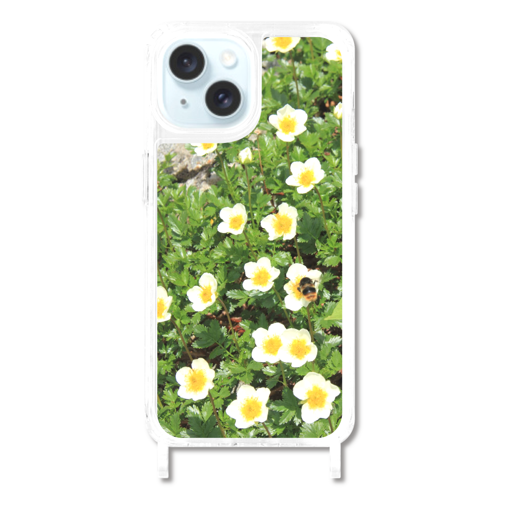 高山植物 チングルマ と 密につどう蜂 日本 TPUソフトケース iPhone15用リング型ストラップホール付クリアケース